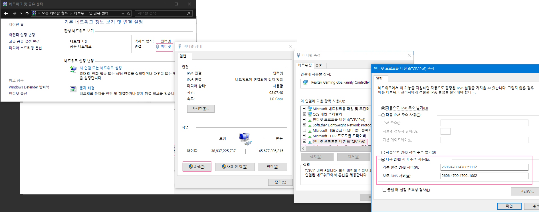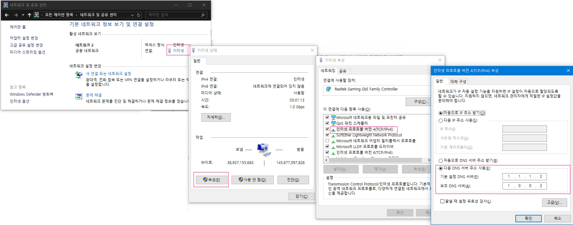 윈도우즈10 제어판 - 네트워크 DNS 설정하기